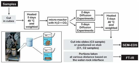 In particular, X-ray diffraction (XRPD), X-ray fluorescence (XRF), Rietveld, and electron with energy dispersive system microscopy (SEM-EDS) (Carl Zeiss, Oberkochen, Germany) analyses were carried out before the diffusion experiments to define chemical composition of the samples and semi-quantitative and morphological evaluation of minerals. SEM-EDS analyses were repeated after experiments to evaluate the alteration degree and the velocity of the reaction front. Infrared spectroscopy (FT-IR) (is50, Thermo Fisher Scientific Inc., Waltham, MA, USA) was used to further evaluate the compositional changes, allowing an easy comparison among spectra of pristine and altered materials. Finally, mercury injection capillary pressure (MICP) analyses were also carried out to measure porosity, pore distribution, and tortuosity.