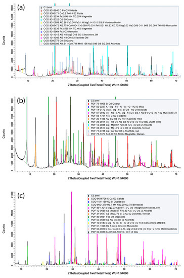 XRPD spectra and Rietveld refinement of rock samples. (a) C1 shale; (b) C2 shale; (c) C3 carbonate. Quantitative data results are in Table 1.