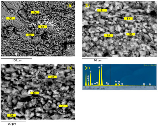 SEM-EDS data of C2 sample in thin section. (a) General aspect at low magnification scale showing a dominant fine clayey matrix that includes larger crystals at the analytical Site 1. S1: pyrite; S2–S4: quartz. (b) Texture and mineralogy of the analytical Site 2. S1: dolomite-siderite; S2: illite, S3: anatase; S4: dolomite-siderite. (c) Texture and mineralogy of the analytical Site 3. S1: kaolinite; S2: dolomite-siderite; S3: muscovite; S4: illite-chlorite. (d) EDS spectrum of Site 1 in panel (a), S1: pyrite. Mineral compositions are related to spectrum for site in Table 4.