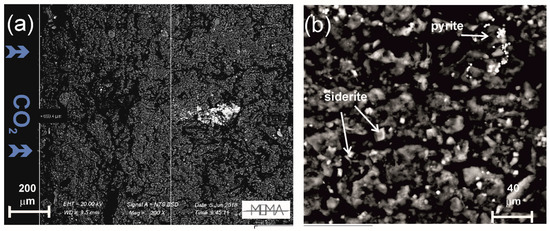 SEM images of sample C1 after 2 days of experiments, oriented with respect to the CO2 entry. (a) Low magnification view. The two white lines represent, from left to the right, the sample outer edge with CO2 richer fluids, the pyrite and other Fe-rich mineral dissolution and the secondary minerals reaction front and, on the right the zone of deposition. (b) Zoom on the matrix with the formation of Fe-richer carbonate (siderite) as a secondary mineral. Images taken from a piece on a stub.