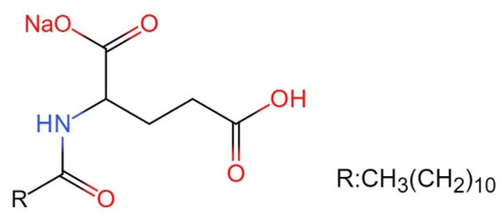 Sodium lauroyl glutamate (SLG) is a sarcosine derivative surfactant composed of a non-polar hydrophobic hydrocarbon chain and a polar hydrophilic group containing a highly reactive carboxyl and amide-based amino acid, as shown in Figure 1. Due to the excellent metal chelating ability, foaming properties, low toxicity, low irritation, and good biodegradability of SLG [30,31,32,33], it is widely used in the petrochemical industry, and in biology, medicine, pharmacology, agriculture, and electroplating [34,35,36]. Therefore, this study first used SLG as the collector on cassiterite flotation because of its special functional group, inexpensive, and environment-friendly characteristics.