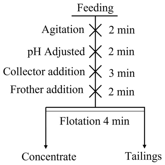 The micro-flotation tests were performed in an XFGII flotation machine with a 40 mL plexiglass flotation cell. These tests were conducted in 5 stages (agitation 2 min, pH adjusted 2 min, various concentrations of collector addition 3 min, 3 × 10−5 mol/L frother addition 2 min, and flotation 4 min), as shown in Figure 3. After the flotation process, the concentrate and tailings were filtered, dried, and weighed to calculate the flotation recovery.