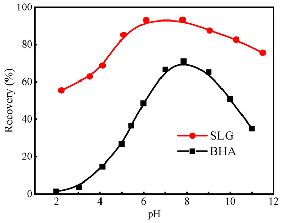 The flotation recovery of cassiterite in the presence of SLG and BHA as a function of pulp pH was also investigated. As shown in Figure 5, the recovery of cassiterite first increased, then reached a plateau and decreased under a strong base solution using SLG or BHA as the collector. The recovery of cassiterite using SLG as a collector was over 50% in the whole pulp pH range. With regards to BHA, the floatability of cassiterite was very weak under high acid and alkaline environments. The maximum flotation recovery of cassiterite was floated by SLG and BHA, which were 93.1% and 71.05%, respectively, at pH 7.8–8.0. These results further indicated that SLG has good acid and alkali resistance.