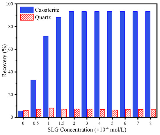 Furthermore, the artificial mixed mineral flotation tests were conducted to verify the selectivity of SLG at pH 7.8 ± 0.2, as shown in Figure 6. The mixed minerals were composed of cassiterite and quartz, and the mass ratio of cassiterite to quartz is 1:1. Figure 6 shows that cassiterite recovery increased sharply when SLG’s initial concentration was less than 1.5 × 10−4 mol/L. When SLG was used as the collector, cassiterite displayed considerable floatability with a maximum recovery of over 93%. However, the quartz recovery has been consistently lower than 8%, and the recovery difference between cassiterite and quartz reached a maximum of 82.9%. SLG can be used to separate cassiterite and quartz effectively.