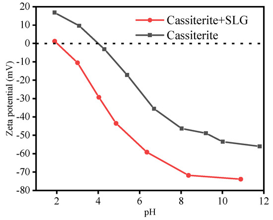 Zeta potential measurements reflect the state of charge on the mineral surface, which helps to reveal the adsorption process of the flotation reagents on the mineral surface. This section discusses the relationship between the zeta potential and pH of cassiterite surfaces floated using SLG as a collector.