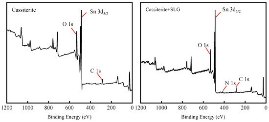 Survey scan XPS spectra of cassiterite sample in the presence and absence of SLG.