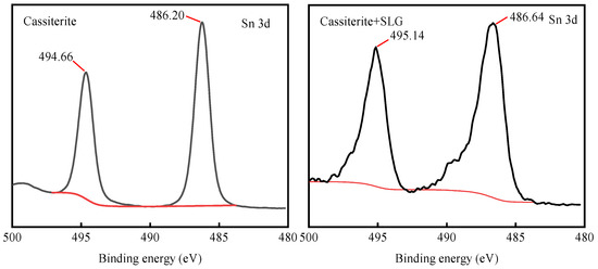 As shown in Figure 10, the XPS bonds of Sn 3d for the original cassiterite had one double peak at 494.66 eV and 486.20 eV, which were assigned to Sn 3d3/2 and Sn 3d5/2, respectively. After SLG treatment, the Sn 3d peaks were shifted to the higher binding energies of 495.14 eV and 486.64 eV, respectively. These features revealed that the chemical circumstances of the Sn atoms on the cassiterite surface had changed, indicating that SLG chemically reacted with tin species to form a surface complex on the cassiterite surface.