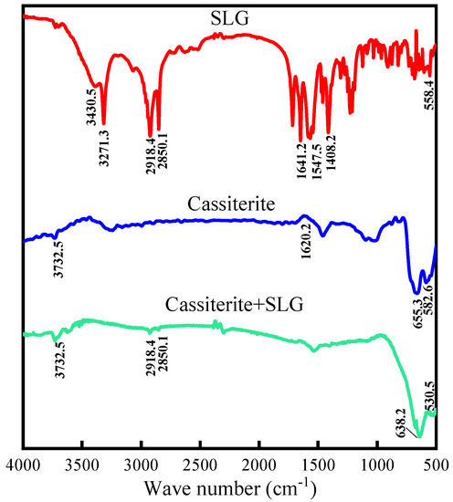 Figure 11 shows the FTIR spectra of SLG, cassiterite, and cassiterite treated with SLG at pH 7.8 ± 0.2. As shown, for SLG, the bands at 3430.5 cm−1 and 3271.3 cm−1 are related to the stretching vibration of N-H. The peaks at 2918.4 cm−1 and 2850.1 cm−1 are attributed to the characteristic peak of -CH2- and CH3- groups, and the peak at 1641.2 cm−1 corresponds to the stretching vibration of the amide carbonyl in -CON-. The peaks at 1547.5 cm−1 and 1408.2 cm−1 are caused by the bending vibration of N-H and the stretching vibration of C-O. In addition, the peak at 558.4 cm−1 is due to the C-N stretching vibration. In the cassiterite IR spectrum, the characteristic bond at 3732.5 cm−1 belongs to the typical hydroxylate adsorption peak of the O-H vibration. This peak of O-H reflected the hydroxylation that occurred on the cassiterite surface in the pulp. The characteristic bond at 1620.2 cm−1 is attributed to the H2O adsorption on the surface of the minerals. The peaks at 655.3 cm−1 and 582.6 cm−1 represent the stretching vibration of the Sn-O vibration.
