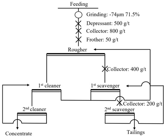 Bench-scale flotation was carried out in an XFD-63 pneumatic flotation machine, using 1.5 L for rougher flotation and 1 L and 0.5 L for cleaner flotation. Before flotation, the raw ore was ground for 8 min in a closed XMQ-240 × 90 ball mill to obtain a sample reaching 71.5% of −74 μm. The raw ore was transferred to the flotation cell with tap water to achieve a pulp density of 30% solids by weight. The slurry was then conditioned for 2 min at 2100 rpm, followed by 3 min of stirring with the required amount of depressant (500 g/t CMC). The suspension was then allowed to condition for 3 min and 2 min with collectors and frothers in sequence. Next, the pulp was floated for 4 min at 1900 rpm with an airflow rate of 7.0 L/min. The rougher stage was followed by two cleaner and two tailing scavenger flotation stages, in which tap water was added to the concentrate of the previous stage to make up the pulp. The simplified flowsheet of the bench-scale flotation tests is shown in Figure 13.