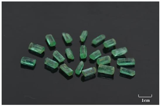 The 20 original emerald samples in this study were provided by Mr. Xiao, a gem dealer (Figure 3). All crystals are hexagonal columns, about 1 cm in length and weigh from 0.15 to 0.38 ct (Figure 3). All the crystals show traces of oil, which fluoresces blue-white under long-wavelength ultraviolet light (Figure 4). Sample A-1, where obvious color banding can be observed, was selected and made into double-sided parallel-polished slices (1 mm thick) with vertical optical axis to study the cause of color banding (Figure 5).