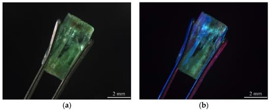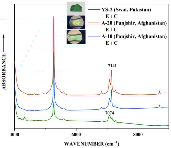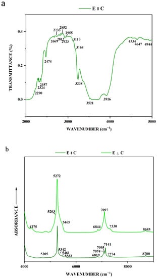 In the near-infrared range of 9000–5000 cm−1, the absorption spectrum band of emerald is related mainly to the combined frequency and double-frequency vibration of structural water []. The right side of Figure 10 shows the near-infrared spectra of the parallel and vertical c-axis in the direction of optical vibration, separately. The sharp and strong spectral peaks of 7141 cm−1 and slightly weaker spectral peaks of 8700, 7274, and 6819 cm−1 of type I water can be observed [,]. The sharp and strong 5272 cm−1 is related to the cofrequency absorption of type I /II water, and the sharp bimodal of 7095, 7074 cm−1, and 5205 cm−1 are related to the double-frequency absorption of type II water [].