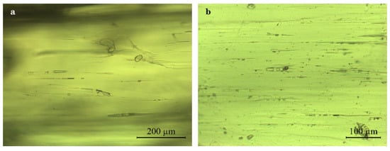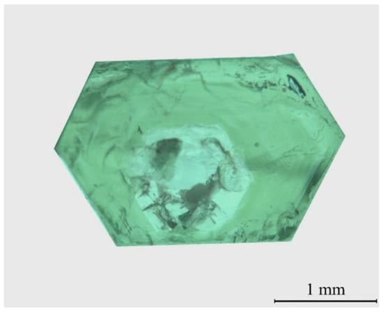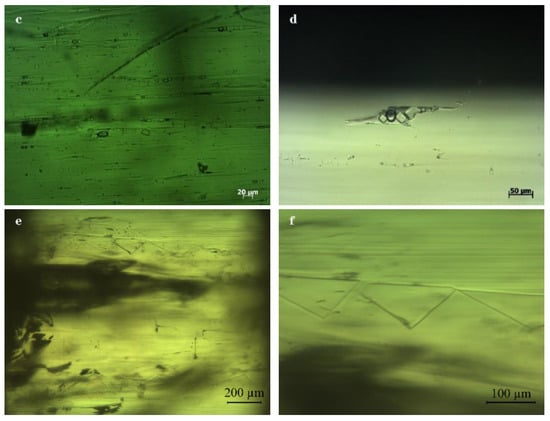 The most distinctive features of the three-phase inclusions in this origin emerald are the high number of solid crystals (Figure 7b,d), most of which are more than three and up to seven (Figure 7c). The size of the crystal varies with the shape of the inclusion: in long tubular inclusions, the crystal is the same width as the tube (Figure 7a–d); nevertheless, in serrated inclusions, the crystal is less than one-third the volume of the inclusion (Figure 7a,d). Most of the crystals are colorless lumps, and no results are obtained by Raman testing. According to the presence of cubic crystals, it is suggested that these inclusions may be NaCl []. Triangular growth characteristics parallel to the c-axis are found in sample A-1 (Figure 7e,f).
