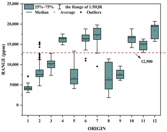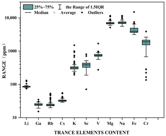 In Figure 8, the box diagram of trace element data of 20 emeralds from Panjshir Valley in Afghanistan were measured by LA-ICP-MS as part of a trace element analysis (Table 2). Figure 8 shows that the samples are rich in Mg (5154.67–11,610.89 ppm), with an average content of 7071.91 ppm; a small amount of P (47.37–273.85 ppm) has an average content of 157.88 ppm; a small amount of Sc (71.34–804.98 ppm) has an average content of 381.50 ppm; and Ga (15.34–34.95 ppm) has an average content of 27.22 ppm. The content of other trace elements, such as Ti, Mn, Ni, and Zn, are lower than 5 ppm. The alkali metal concentrations from the lowest to the highest are Rb 19.93–50.07 ppm (average 25.72 ppm), Cs 29.01–53.50 ppm (average 33.15 ppm), Li 74.83–131.01 ppm (average 84.14 ppm), K 194.96–1503.69 ppm (average 359.11 ppm), and Na 5586.07–11,219.99 ppm (average 7313.58 ppm). The total concentration of alkali metal elements ranges from 5904.80 to 12,958.26 ppm. The average is 7815.70 ppm.