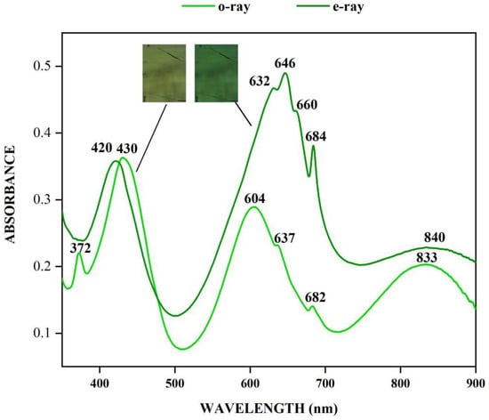 Figure 9 showed the UV-Vis-NIR spectrum of sample A-1 with high Fe content, showing obvious absorption peaks of Fe2+, Fe3+, and Cr3+ (Figure 9). Under ordinary-ray, the spectrum has a wide absorption band of 430 and 604 nm; in extraordinary-ray, 420 and 632 nm wide absorption bands are displayed. George Bosshart (1991) believed that after the Cr and V spectra overlap, the positions of absorption bands will shift to each other’s peak positions and the slope of absorption peaks will become steeper. Therefore, the above absorption bands belong to the common absorption of V3+and Cr3+ []. The 637 and 682 nm absorption peaks displayed under ordinary-ray and 646, 660, and 684 nm absorption peaks displayed under extraordinary-ray belong to the Cr3+ absorption [,,]. In sample A-1, Cr/V ≈ 1, and at Cr/V > 1, the V3+ absorption shoulder at 395 nm is not usually shown []. The sharp absorption peak at 370 nm displayed under ordinary-ray belongs to Fe3+, while this absorption peak is not displayed under extraordinary-ray. The medium absorption peak of 840 nm in extraordinary-ray and 833 nm in ordinary-ray is attributed to Fe2+ []. Most of the emeralds in Afghanistan showed obvious Fe absorption, and the absorption peak of Fe2+ under o-ray is steeper than that under e-ray, which is consistent with the higher Fe content.
