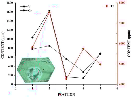 In the emerald of the Panjshir Valley in Afghanistan, the content of transition metal elements is high, and Cr, V, and Fe may contribute to the color. Among them, Cr = 136.02–3896.84 ppm, with an average value of 1838.44 ppm; V = 275.03–1687.07 ppm, with an average value of 765.53 ppm; and Fe varied from 3173.22–15,030.29 ppm, with an average value of 4458.49 ppm. Cr/V range spans 0.3 to 3.7. Except for A-20, the content of Cr in all samples was higher than that of V.