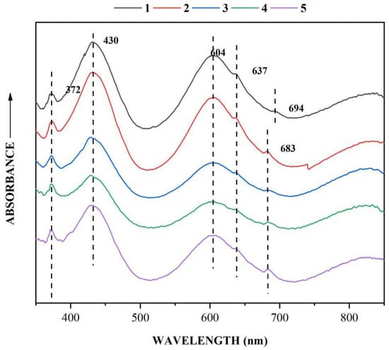Figure 12 shows the variation of the content of the chromogenic elements Cr, V, and Fe contained in the different color bands in color-zoned sample A-1. From position 1 to 5, the color shades changed in line with the variation of Cr and V contents. In sample A-1, the concentrations of Cr2O3 and V2O3 are 0.02–0.23 wt% and 0.05–0.15 wt%, respectively. The darker green color at the edges is caused by higher levels of Cr and V. The UV-Vis-NIR spectra corresponding to the points analyzed for chemical composition indicated that the darker the color of the ribbon, the higher the content of Cr and V and the stronger their relative absorption (Figure 13). In addition, the spectrum also shows the absorption of Fe3+, but the variation of Fe content does not coincide with Cr and V, as seen in Figure 13, and the relative intensity of the absorption peak of Fe3+ at 370 nm is consistent in Figure 14.