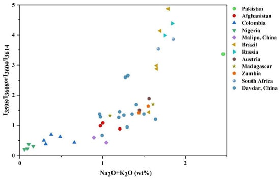 This figure shows the relationship between the content of Na2O+K2O in emeralds from different regions and the intensity ratio of Raman peaks, representing different water types. The spectral peaks of 3598 cm−1 (or 3604 cm−1) and 3608 cm−1 (or 3614 cm−1) are related to type II water and type I water, respectively. Data source [,].