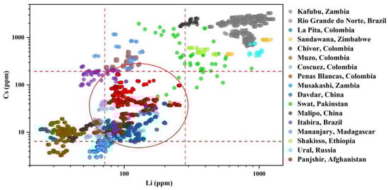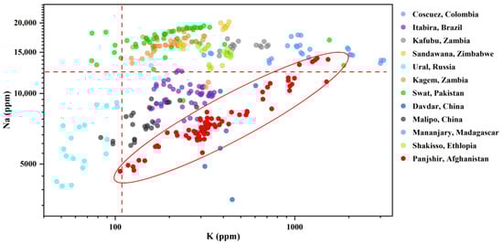 Figure 19 shows the distribution of Li and Cs in emeralds from the world’s major origins, from which emeralds can be distinguished from most of the world’s origins. For example, a part of the Colombian mines, because of their lower Li and Cs content than the Panjshir Valley emeralds’ content, while the Swat Valley in Pakistan and the Urals in Russia, Ethiopia, Sandawana, Madagascar, Zambia, and Malipo in China have higher Li and Cs content than that of the Panjshir Valley emeralds [,,,,,,].