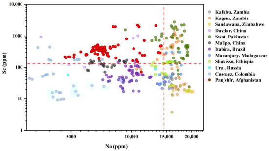 From the distribution maps of Na and Sc, among the provenances shown in Figure 20, the Panjshir Valley emerald from Afghanistan belongs to the medium-low Na and medium-high Sc, which can be distinguished from the Davdar Township emerald from China, but the sample data from Davdar Township, China, are too small to represent general conclusions. Meanwhile, the data for the Coscuez emerald from Colombia and the Panjshir emerald from Afghanistan overlap in this binary plot [].
