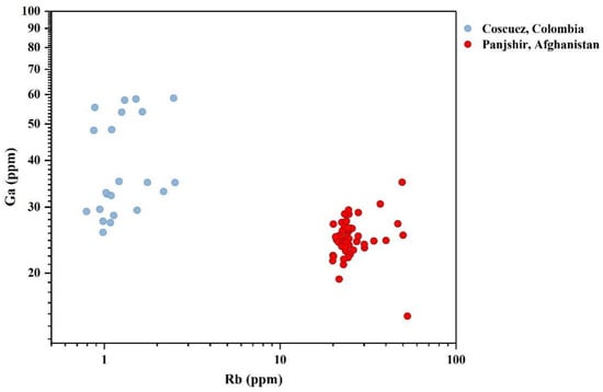 The log binary graph of Rb and Ga shows that Panjshir emerald and Coscuez emerald are not similar in this data and can be distinguished. Data source: [].