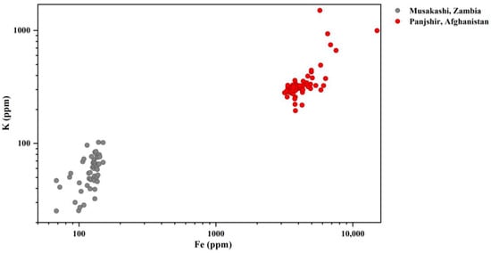 The log binary graph of Fe and K shows that Panjshir emeralds and Kusakashi emeralds are quite different and can be distinguished. Data source: [,].