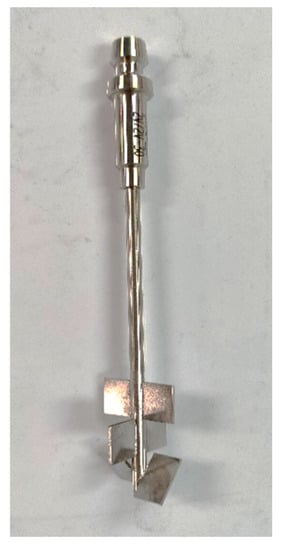 Pulp rheology was measured with the rotary rheometer (MCR720, Anton Paar, Graz, Austria). It is necessary to improve the rheometer partially because the flotation pulp is an unstable solid–liquid–gas three-phase suspension system that is easy to settle; the rheological properties are very complex and difficult to measure. In order to weaken the influence of particle sedimentation on the measurement results, the traditional cylindrical inner cup was replaced with a paddle-type stirring rotor (Figure 1). Rheological measurements mainly include the shear rate vs shear stress test (controlled shear rate mode) for measuring the apparent viscosity of the pulp (equation 1) and the shear stress vs. shear deformation test (controlled shear stress mode) for the yield stress of the pulp. The samples for rheology tests were prepared by mixing required mineral with water to meet desired pulp concentration. The pulp pH was adjusted to 9.5−10.0 using NaOH solution, and a pH meter was used to measure pH. The tests were conducted at room temperature (about 20 °C).