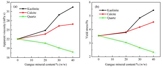 Effect of gangue mineral content on (a) apparent viscosity and (b) yield stress of smithsonite pulp using octadecylamine concentration: 150 mg/L at pH 9.5−10 and 28.57% solid concentration.