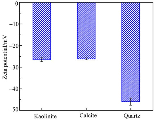 However, the apparent viscosity and yield stress of the mixed minerals of smithsonite-quartz decreased with the increase of quartz content, indicating that quartz could disperse the mixed mineral pulp. The zeta potential of minerals was tested to explain this reason, and the results are shown in Figure 3. Zeta potential can characterize the stability of the colloidal dispersion system: the higher the absolute value (positive or negative) of zeta potential, the more stable of the dispersion system. As can be seen from Figure 3, the surface of kaolinite, calcite, and quartz was negatively charged at pH 9.5, but the absolute value of zeta potential of quartz was obviously higher than that of kaolinite and calcite. This shows that quartz particles have better dispersion due to the strong electrostatic repulsion, so the apparent viscosity and yield stress of the mixed minerals of smithsonite-quartz decreased.
