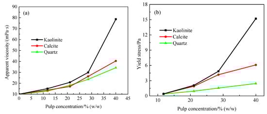 Pulp rheology is a discipline to study the flow and deformation properties of slurry fluid under the action of external shear stress during mineral processing [,]. Pulp rheology (yield stress and apparent viscosity) is a quantitative indicator to characterize the degree of particle aggregation or dispersion, which is an important factor affecting mineral flotation recovery [,,]. Rheology is an important property to understand and maintain the economic viability of the flotation process especially of low-grade and complex ores []. The flotation pulp belongs to a complex multiphase suspension system. The rheological property of the pulp is affected by the mineral composition, especially the clay minerals. Different types of clay minerals usually exist in the ore. They have several potential harmful effects on flotation. First, when clay minerals attach to the mineral surface, they will reduce the floatability of the valuable minerals. Second, clay minerals form a network structure in the pulp, which may lead to the increase of pulp viscosity or gangue entrainment, and then decrease the flotation recovery and the grade of flotation products [].