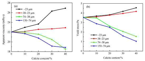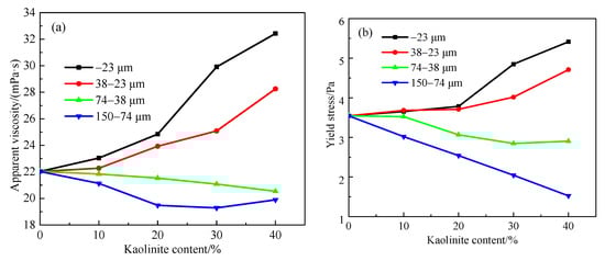 As shown in Figure 6, with the increase of the content of kaolinite in the mixed mineral of smithsonite-kaolinite, the apparent viscosity and yield stress of different particle sizes presented different trends. With the increase of the content of coarse kaolin (150–74 μm, 74–38 μm), the apparent viscosity and yield stress of the pulp slightly decreased. Nevertheless, with the increase of the content of fine kaolin (38–23 μm, −23 μm), the apparent viscosity and yield stress showed an increasing trend. The higher the kaolinite content was, the greater the apparent viscosity and yield stress would appear. Das et al. [] evaluated the influence of mineralogy and particle size on the viscosity of high concentration pulp and found that the pulp containing fine particles presented a higher viscosity and poor rheology and that mixing montmorillonite with some pure minerals can improve the rheological properties of pulp.