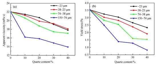 The mixed mineral of smithsonite-calcite showed a similar trend with smithsonite-kaolinite. However, compared with the mixed mineral of smithsonite-kaolinite, the influence of fine fraction on the apparent viscosity and yield stress of smithsonite-calcite pulp was relatively small (see Figure 7). For different particle sizes of quartz, it is noteworthy that the apparent viscosity and yield stress of the smithsonite-quartz decreased with the increase of quartz content in the mixed mineral. In addition, the apparent viscosity and yield stress decreased greatly with the increase of particle size of quartz, especially the 150–74 μm. Thus, the presence of quartz in the pulp could improve the rheological properties.
