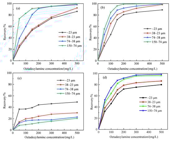 In pulp, the basic behavior of the flotation process is that the mineral particles with hydrophobic surface adhere to the bubbles and then float up. In this research, the floatability of smithsonite, quartz, kaolinite, and calcite with different particle sizes under the action of octadecylamine were investigated through flotation experiments. The pulp pH and concentration were 9.5–10.0 and 28.57%, respectively. The flotation results are shown in Figure 9.