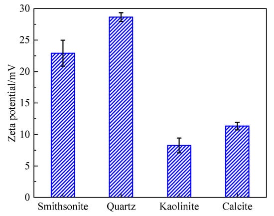 The adsorption of octadecylamine on a mineral surface can be explained through the zeta potential. Figure 10 showed the zeta potential of minerals in the presence of 150 mg/L octadecylamine at pH 9.5. The zeta potentials of smithsonite, quartz kaolinite, and calcite are positive, indicating that the cationic collector octadecylamine was adsorbed on the surface of the four minerals. It is noteworthy that the floatability of smithsonite, quartz, kaolinite, and calcite are well consistent with the zeta potential values. Namely, quartz has the good floatability with the highest zeta potential, followed by smithsonite. Kaolinite showed poor floatability with a low zeta potential.