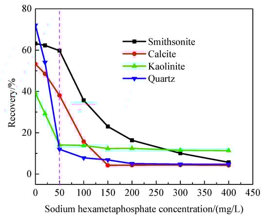 With octadecylamine as the collector, the dosage was 150 mg/L, and the pH was 9.5–10.0; the flotation behaviors of fine smithsonite, quartz, kaolinite, and calcite with sodium hexametaphosphate as the inhibitor for gangue minerals are shown in Figure 11.