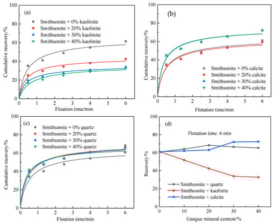 The floatability of (a) smithsonite, (b) quartz, (c) kaolinite, (d) calcite using octadecylamine concentration: 150 mg/L at pH 9.5−10 and 28.57% solid concentration.