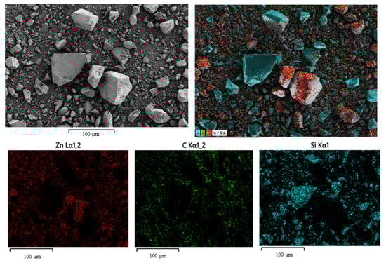 SEM-EDS pictures of flotation concentrate of the mixed mineral of smithsonite-quartz.