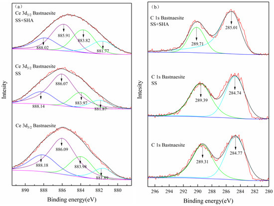 Figure 11b shows the high-resolution C 1s XPS spectra of the pure and flotation reagent-treated bastnaesite samples, and the detailed analysis results of the C 1s XPS spectra are shown in Table 7. The results show that the C 1s XPS spectra of pure bastnaesite have two peaks at the binding energies of C-C and of 284.77 eV and 289.31 eV, respectively. The results show that the C 1s XPS spectra of pure bastnaesite can have two component peaks at binding energies of 284.77 eV and 289.31 eV from C-C and , respectively [53,54]. In the C 1s XPS spectra of the bastnaesite treated by SS alone, there is no obvious shift of the C 1s peak, while the peaks at 284.77 eV and 289.31 eV move forward by 0.24 eV and 0.40 eV, respectively, after SS and SHA treatment. This shift may be due to the superposition of the SHA C=O group with on the surface of the bastnaesite [55].
