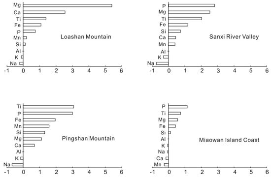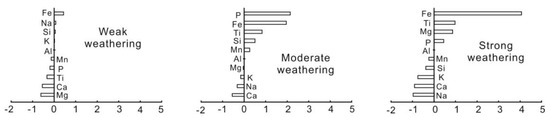 where Cj,w and Cj,p represent the contents of mobile elements in the sample and unweathered rocks, respectively. Ci,w and Ci,p represent the stable elements in the sample and unweathered rocks, respectively. τj is defined as the mass transfer coefficient. A value of τj = 0 denotes no mobility, whereas τj = −1 denotes complete mobility, and τj > 0 denotes external additions. By calculating the variation ratio of an element relative to some stable elements (e.g., K, Ti, Al, etc.), Al was chosen as the immobile reference element in this study. Stable elements in the parent bedrock of the 3 study sites are necessary for calculating the mass transfer transformations between the parent rock and the samples taken from the field. However, we do not have such samples. Fortunately, the granitic rocks of the three study sites have previously been well studied [33,35,43]. Therefore, we can cite the data of the main elements in the local bedrock from published papers for our calculations (see later).