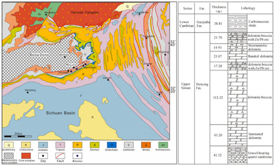 - Wang, X.H.; Xue, C.J.; Li, Z.M.; Li, Q.; Yang, R.J. Geological and geochemical characteristics of the Mayuan lead-zinc deposit in the northern margin of Yangtze landmass. Miner. Depos. 2008, 27, 37–48. [Google Scholar]