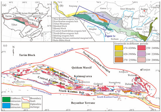 (a) Tectonic map of China (modified after [31]). (b) Location and tectonic map of the Central Orogenic Belt in China (modified after [31]). (c) Schematic geological map of the Eastern Kunlun Orogen showing the distributions of igneous rocks in the Phanerozoic and the location of Kaimuqi area (modified after [32]).