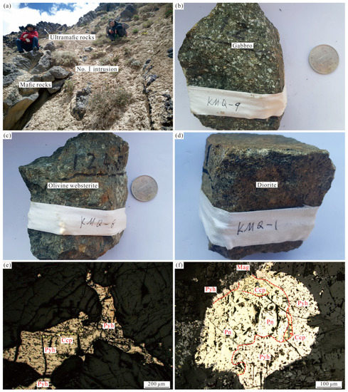 (a) Field photographs of the No. Ⅰ mafic–ultramafic complex. (b) Hand specimen of gabbro. (c) Hand specimen of olivine websterite. (d) Hand specimen of diorite. (e,f) Representative photomicrographs of the major metallic minerals (plane-polarized reflected light). The mineral abbreviations are after [39]: Pyh–pyrrhotite, Ccp–chalcopyrite, Mag–magnetite, Pn–pentlandite.