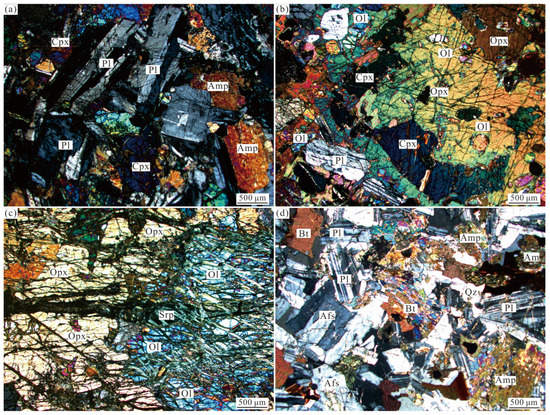 Representative photomicrographs of mafic–ultramafic rocks and diorite (cross-polarized transmitted light). (a) Gabbro. (b) Olivine websterite. (c) Lherzolite. (d) Diorite. The mineral abbreviations are after [39]: Pl—plagioclase; Cpx—clinopyroxene; Amp—amphibole; Ol—olivine; Opx—orthopyroxene; Srp—serpentine; Afs—alkali feldspar; Bt—biotite; and Qz—quartz.