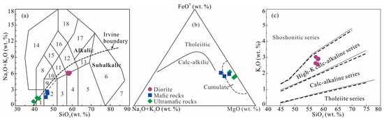 Major element geochemical diagrams of (a) SiO2 versus (Na2O+K2O) (modified after [47]), (b) FeOT−(Na2O+K2O)−MgO (modified after [48]) and (c) SiO2 versus K2O (modified after [49]) for the mafic–ultramafic rocks and diorites. Explanation of numbers in (a): 1—olivine gabbro; 2—gabbro; 3—gabbro diorite; 4—diorite; 5—granodiorite; 6—granite; 7—quartzolite; 8—foid gabbro; 9—essexite; 10—monzogabbro; 11—monzodiorite; 12—monzonite; 13—quartz monzonite; 14—foidolite; 15—foid monzodiorite; 16—foid monzosyenite; 17—syenite; 18—foid syenite.
