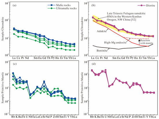 Chondrite-normalized REE distribution patterns (chondrite REE values from [50]) of the (a) mafic–ultramafic rocks and (b) diorites and primitive mantle-normalized trace-element patterns (primitive mantle values from [51]) of the (c) mafic–ultramafic rocks and (d) diorites. The data of Fulugou sanukitic high-Mg andesite (HMA) in the Western Kunlun Orogen were cited from [52]. The data of boninite were cited from [53], and the remainder data were cited from [54].
