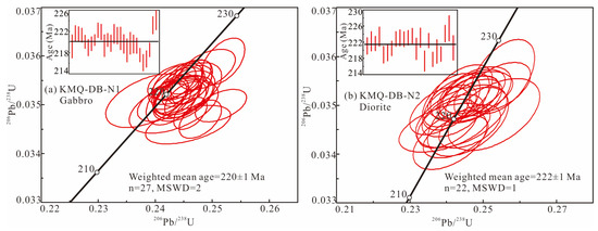 Zircon U–Pb concordia and weighted mean age diagrams of (a) gabbro and (b) diorite.