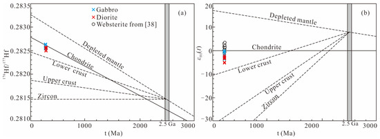 (a) t(Ma) versus 176Hf/177Hf and (b) t(Ma) versus εHf(t) diagrams of zircon from gabbro and diorite (modified after [55]). The data on websterite in the same intrusion were cited from [38].