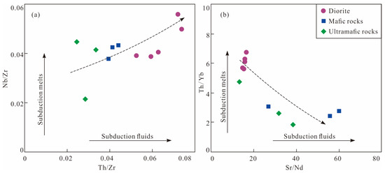 Diagrams of (a) Th/Zr versus Nb/Zr (modified after [96]) and (b) Sr/Nd versus Th/Yb (modified after [97]) of the mafic–ultramafic rocks, showing the addition of slab-derived melts or sediment contaminants in mantle sources.