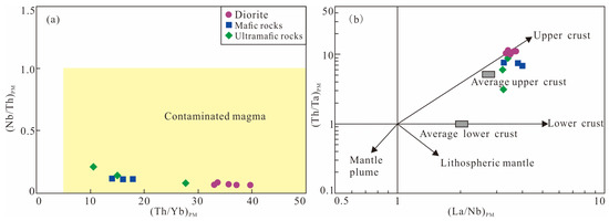 Crustal contamination usually produces geochemical “signals” in magma, such as increases in SiO2, K2O, Rb, Ba, Th, Zr, Hf and S contents and decreases in P2O5 and TiO2 contents [20,92,93]. Because (Nb/Th)PM ratios <1 and (Th/Yb)PM ratios >5 were believed to be indicative of a crustally contaminated mantle-derived magma [94,95], a crustal contribution was notable across the mafic–ultramafic suite (Figure 11a). Furthermore, the mafic–ultramafic rocks were scattered and plot along the crustal evolution trend line and were particularly close to the average upper crust (Figure 11b).