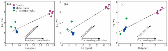 Diagrams of (a) La versus La/Sm, (b) La versus La/Yb (c) and Th versus Th/Yb of the mafic–ultramafic rocks and diorites, showing the partial melting evolution trend (modified after [103]).