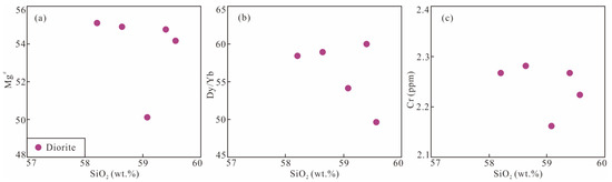 Diagrams of (a) SiO2 versus Mg#, (b) SiO2 versus Dy/Yb and (c) SiO2 versus Cr of the diorites, documenting the low probability of fractional crystallization from mafic–ultramafic magma (modified after [102]).